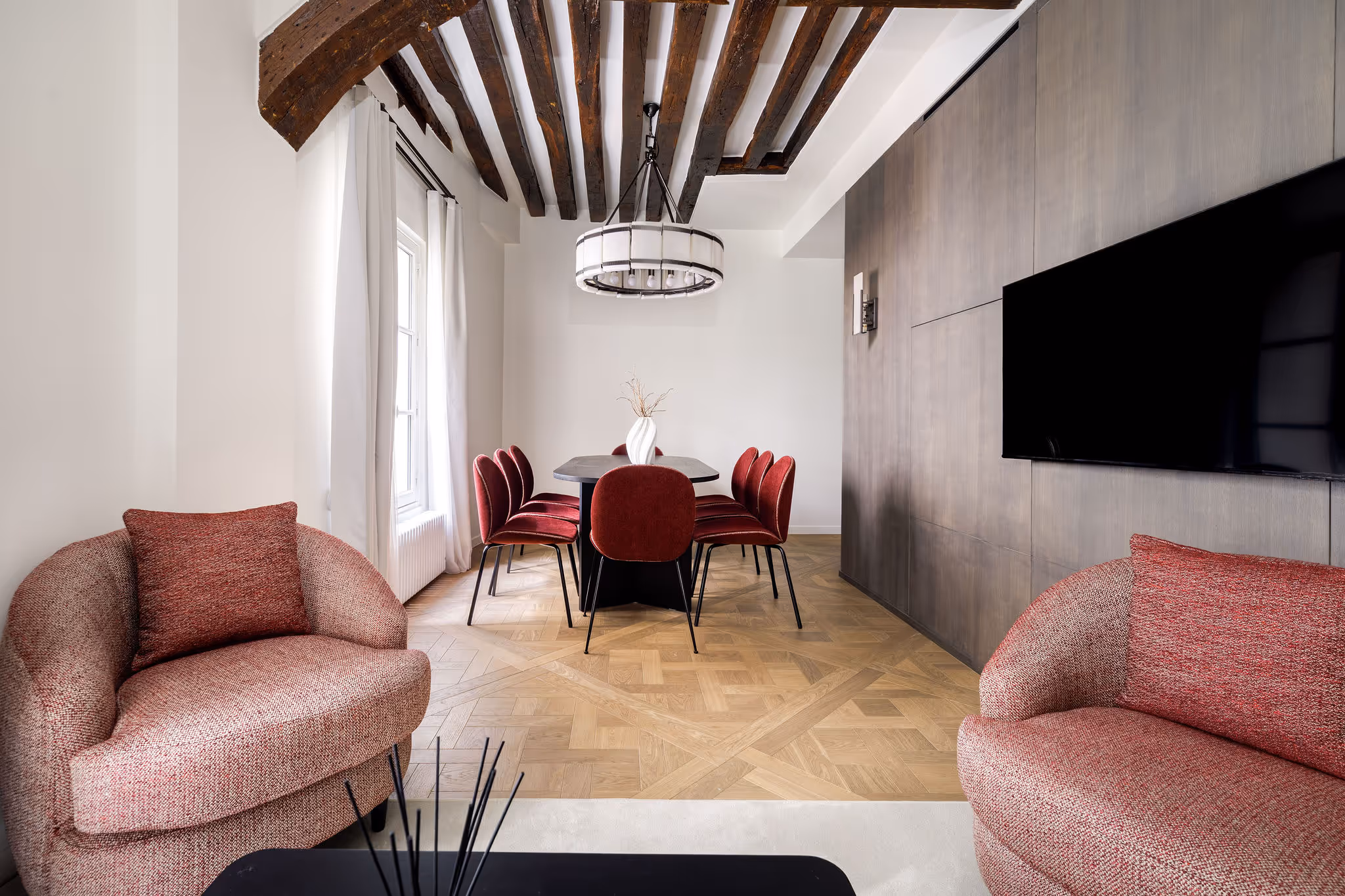 Designed by our architects, this remarkable duplex captures the character and authenticity of the Marais. Located on the ground floor and accessed via a private courtyard offering peace and privacy, it features a charming living space with exposed beams and two staircases. Fully air-conditioned, it blends Parisian allure with contemporary comfort.