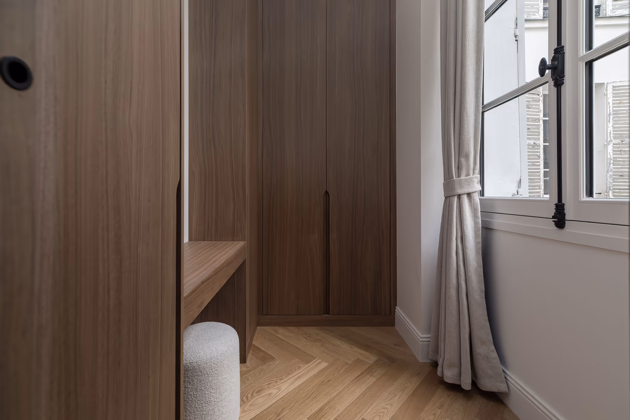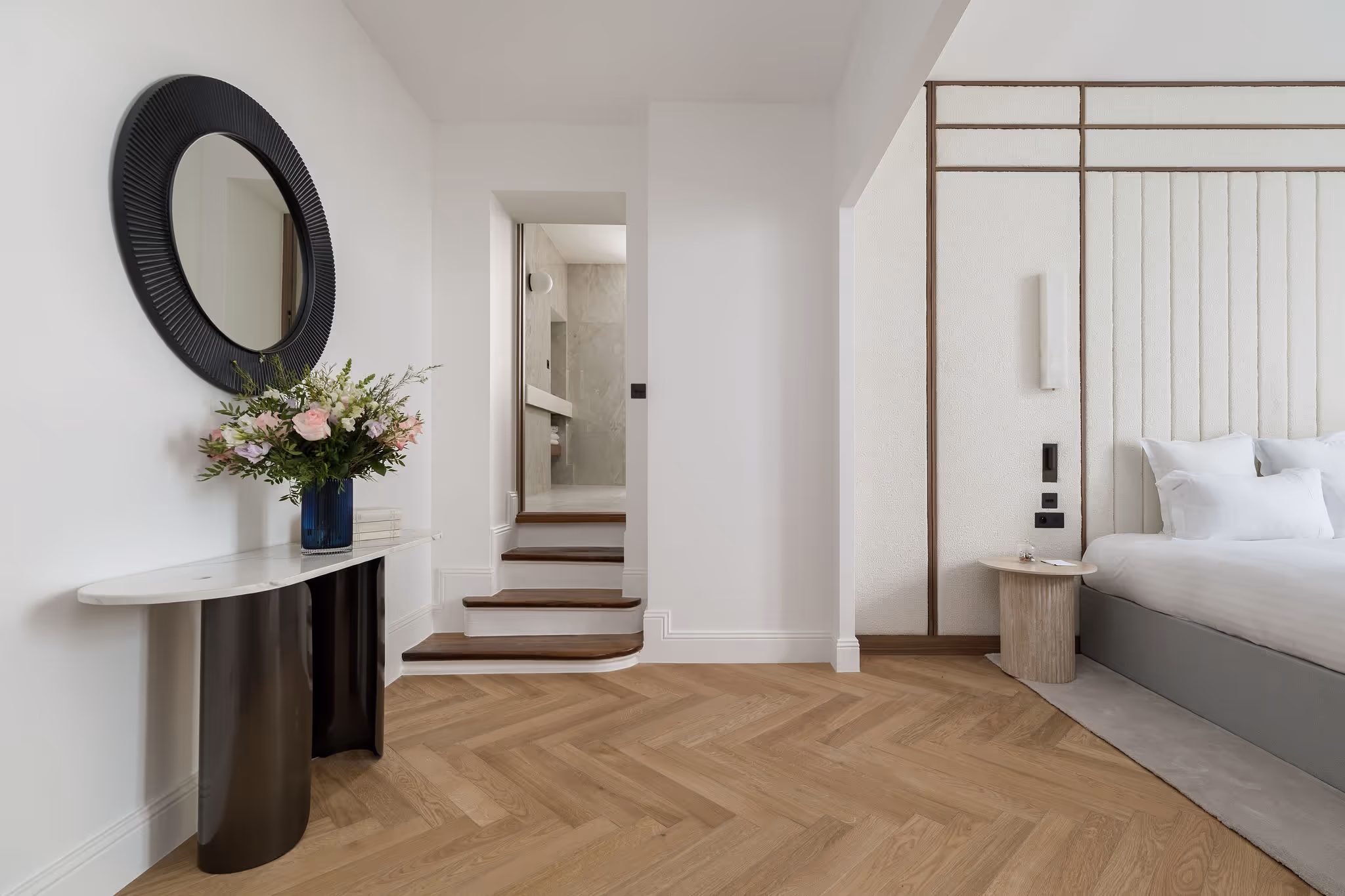 The ground-floor bedroom has a double-shower bathroom and toilet; upstairs, the second bedroom features a walk-in closet and bathroom with bathtub, shower, and toilet. The third bedroom offers a desk and bathroom with shower and toilet. Herringbone parquet, bespoke woodwork, and meticulous finishes highlight the prestige of this residence, where every detail enhances the guest experience.